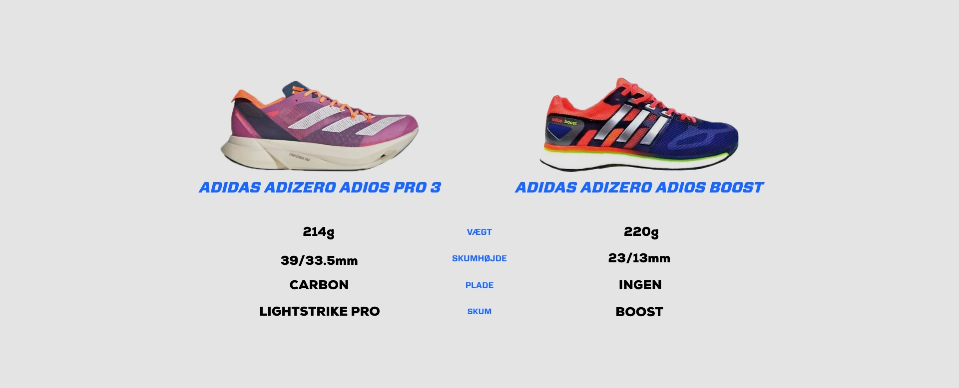 Per semplicità, d'ora in poi mi riferirò alle scarpe rispettivamente come Adios Boost e Pro 3.