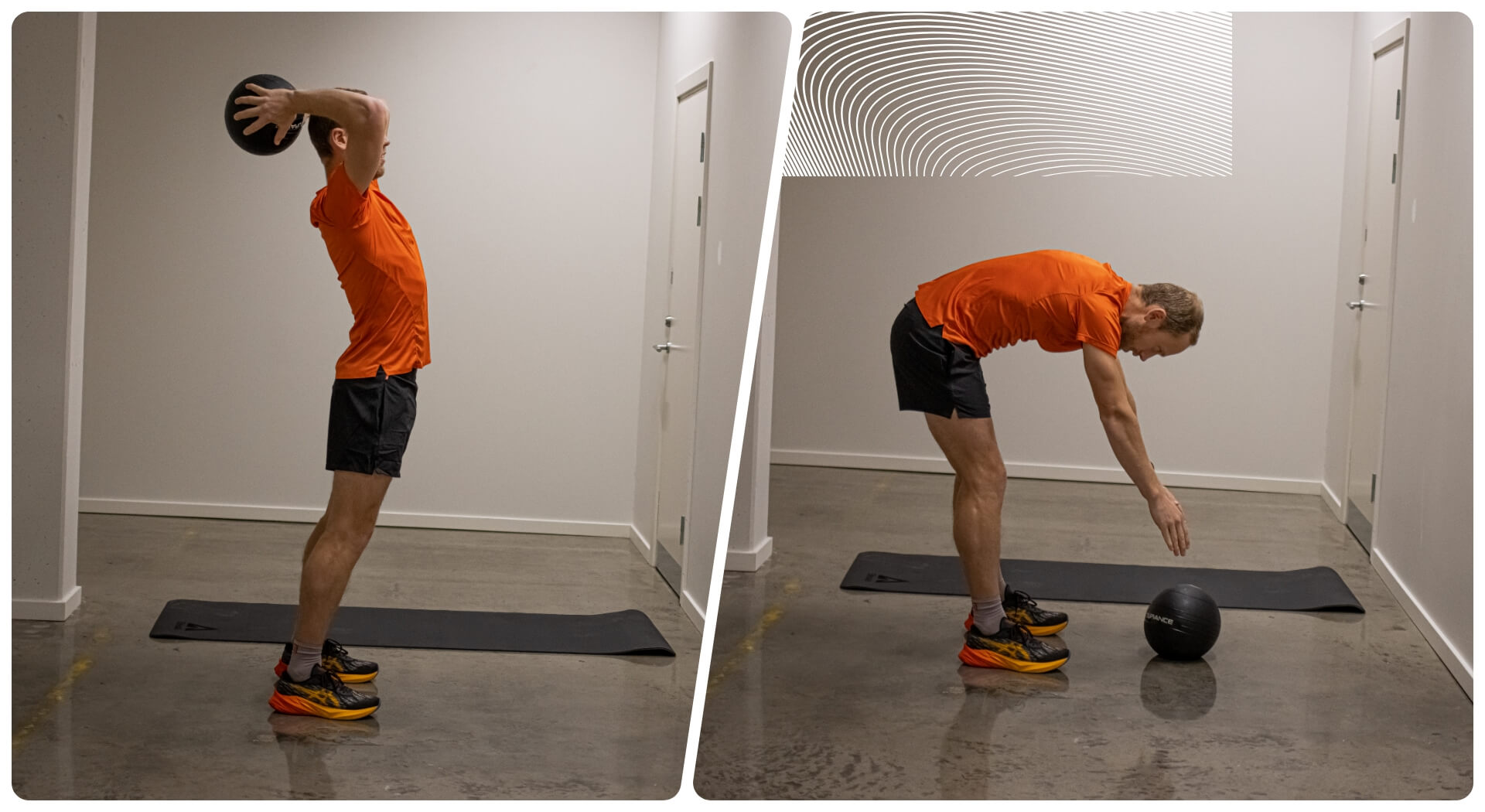 Este é o complemento para trabalhar a parte da frente - ou seja, incluindo os flexores da anca e abdominais. A ideia é que não são os braços que fazem todo o trabalho de atirar a bola ao chão, mas sim os abdominais e flexores da anca, ao dobrarem na anca e curvarem nas costas, fazendo com que a bola seja atirada ao chão.
